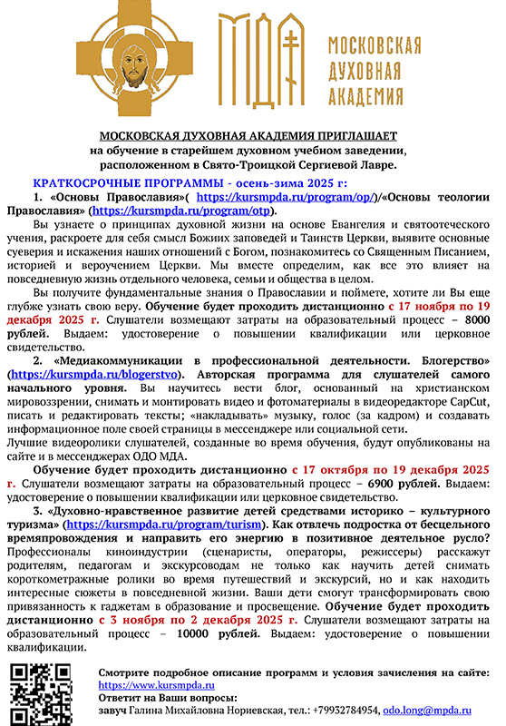 Краткосрочные программы обучения в Московской Духовной АкадемииОсень-зима 1925 г.