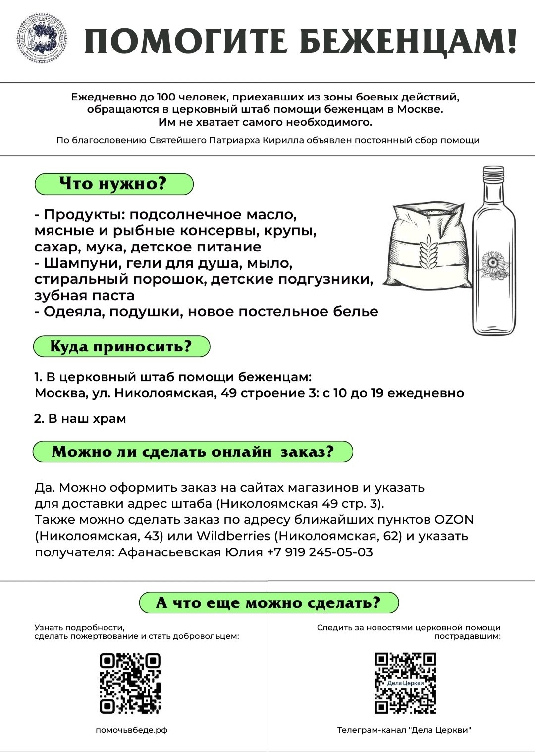 По благословению Святейшего Патриарха Кирилла объявлен сбор помощи беженцам, приехавшим из зоны боевых действий.